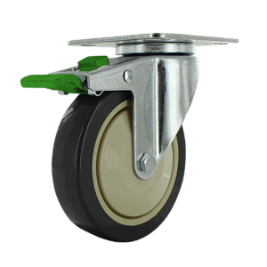 Industrial Swivel Caster with Zinc Plated Steel with Lacquer Dip Yoke, 4″ X 4 1/2″ Plate Mount, 5″ X 1 1/4″ TPU A98 Crown Tread Gray on Tan Wheel, 3/8″ Dual Precision Bearings with 3/8″ Axle and Nylon Lock Nut. With Side Brake.