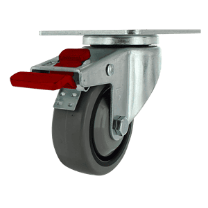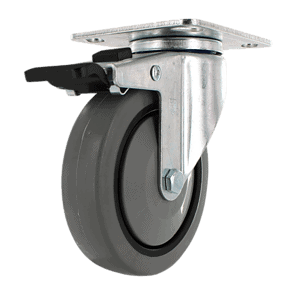 Industrial Swivel Caster with Zinc Plated Steel with Lacquer Dip Yoke, 4″ X 4 1/2″ Plate Mount, 3 1/2″ X 1 1/4″ TPR A70 Crown Tread Gray on Black Wheel, 3/8″ Dual Precision Bearings with 3/8″ Axle and Nylon Lock Nut. With Directional Lock Brake.