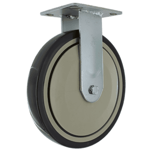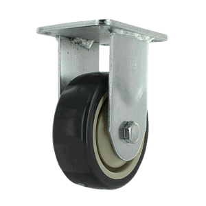 Industrial Rigid Caster with Zinc Plated Steel with Lacquer Dip Yoke, 4″ X 4 1/2″ Plate Mount, 3 1/2″ X 1 1/4″ TPU A98 Crown Tread Gray on Tan Wheel, 3/8″ Dual Precision Bearing with 3/8″ Axle and Nylon Lock Nut.